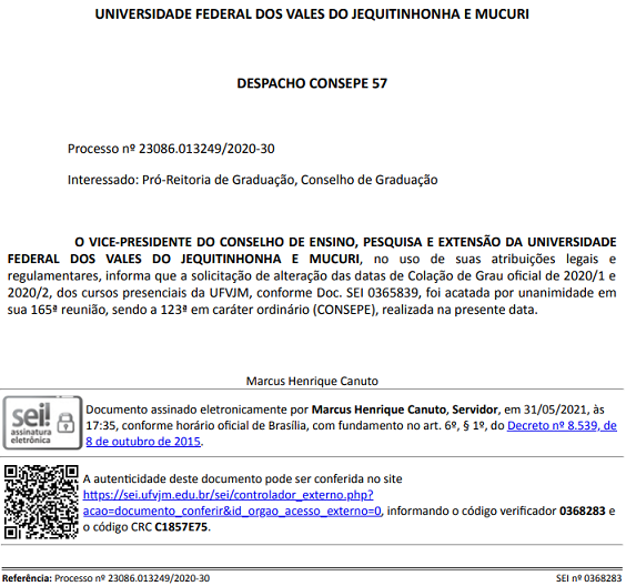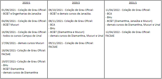 A PROGRAD informa que as datas de Colação de Grau estão atualizadas no Calendário Acadêmico, conforme deliberação do CONSEPE.